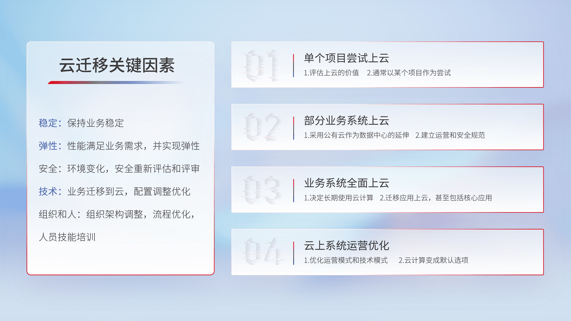 结合实际业务,,从规划设计、、、、云平台选型、、、云原生改造、、数据迁移、、、集成交付,,,迁移全过程为客户识别最佳上云路径,,,,做好风险识别管理,,,设计网络架构、、身份权限、、、、安全审计合规、、操作审计、、日志审计、、监控告警策略、、、、多站点容灾设计等,,对云上基础设施进行整体规划,,提升IT治理水平,,,,以满足弹性、、高可用、、高性能的需求。。。。