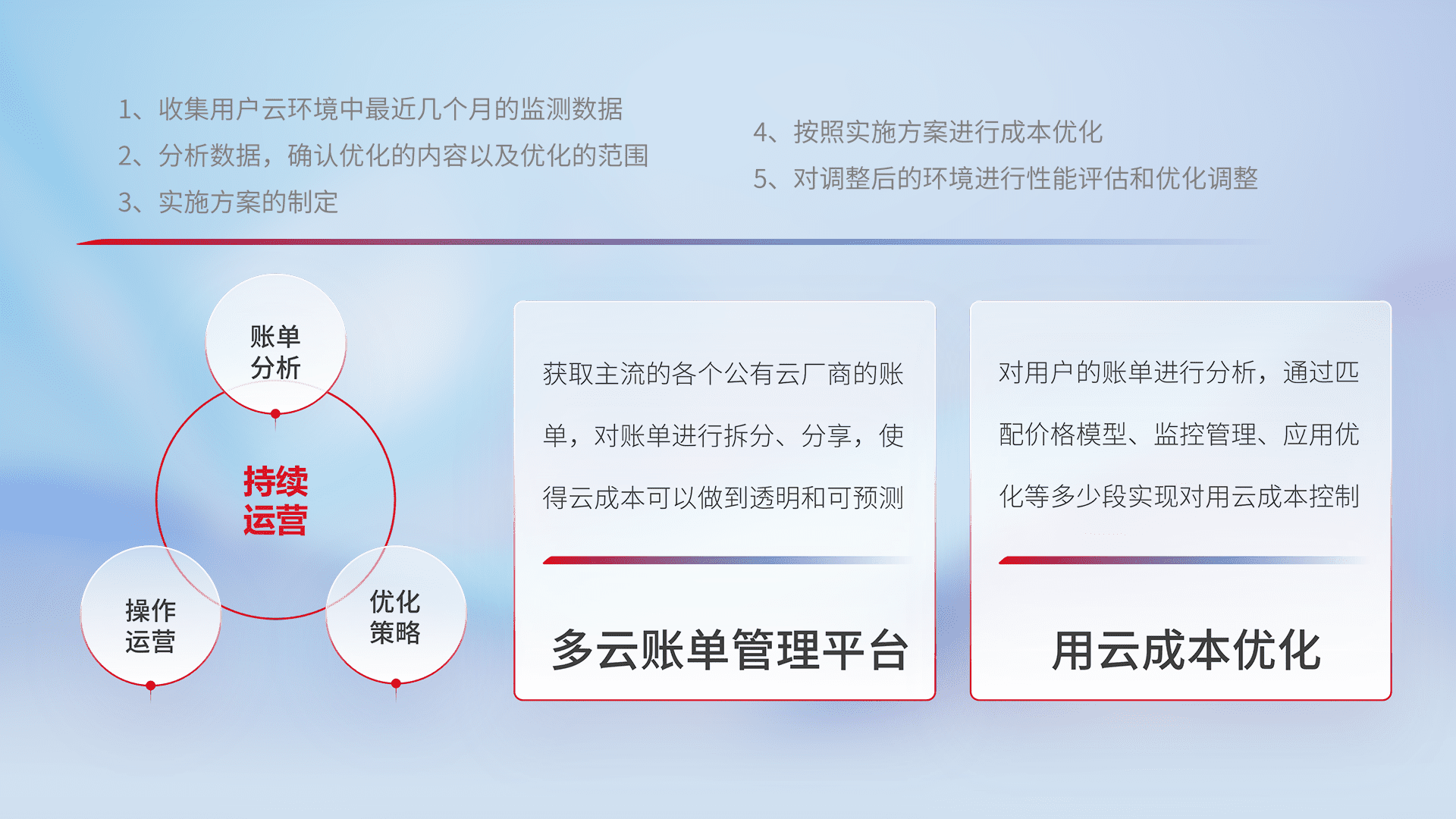 通过多云纳管,,,,以统一的资源数据模型把客户的云资源进行抽象和封装,,进而实现对多云资源的统一操作,,保障云资源管理的可靠性、、稳定性与可用性。。。。量身定制化运维内容,,配置、、、、开发运维、、、补丁管理、、、、备份、、、监控、、、认证和访问管理、、、、审计和日常巡检等,,,,保障在用云过程中的可靠度,,稳定度以及高可用率。。。